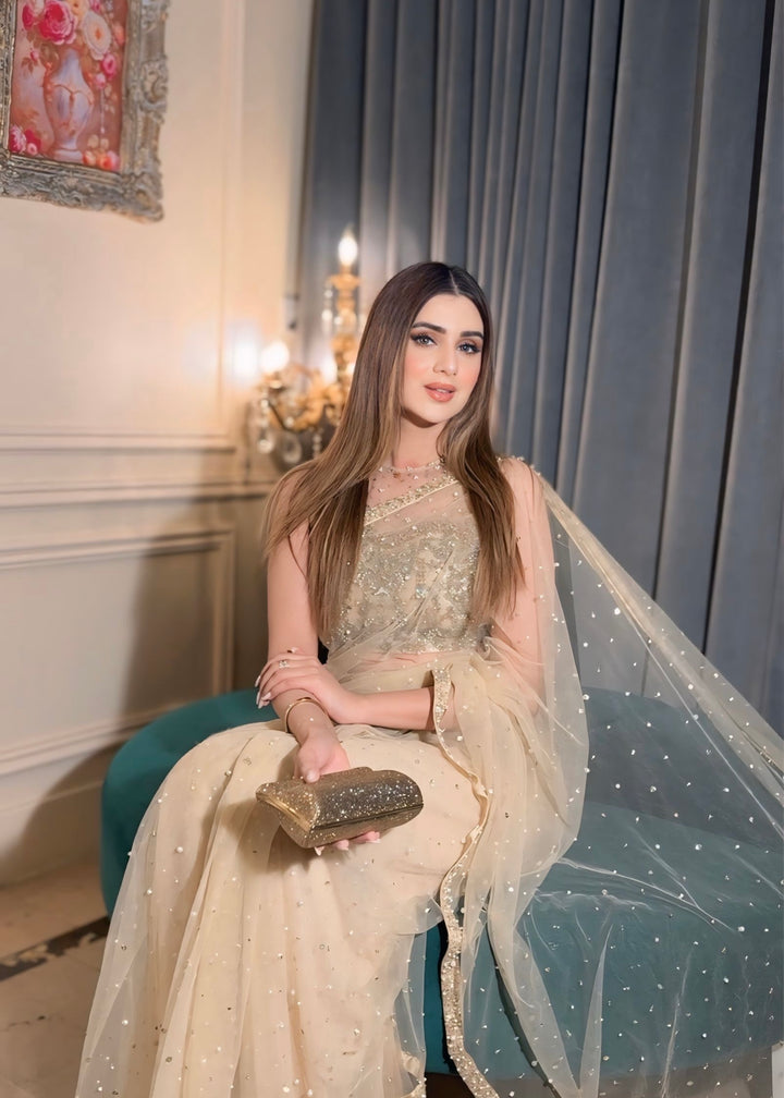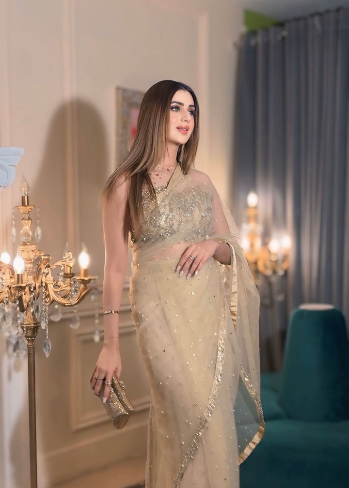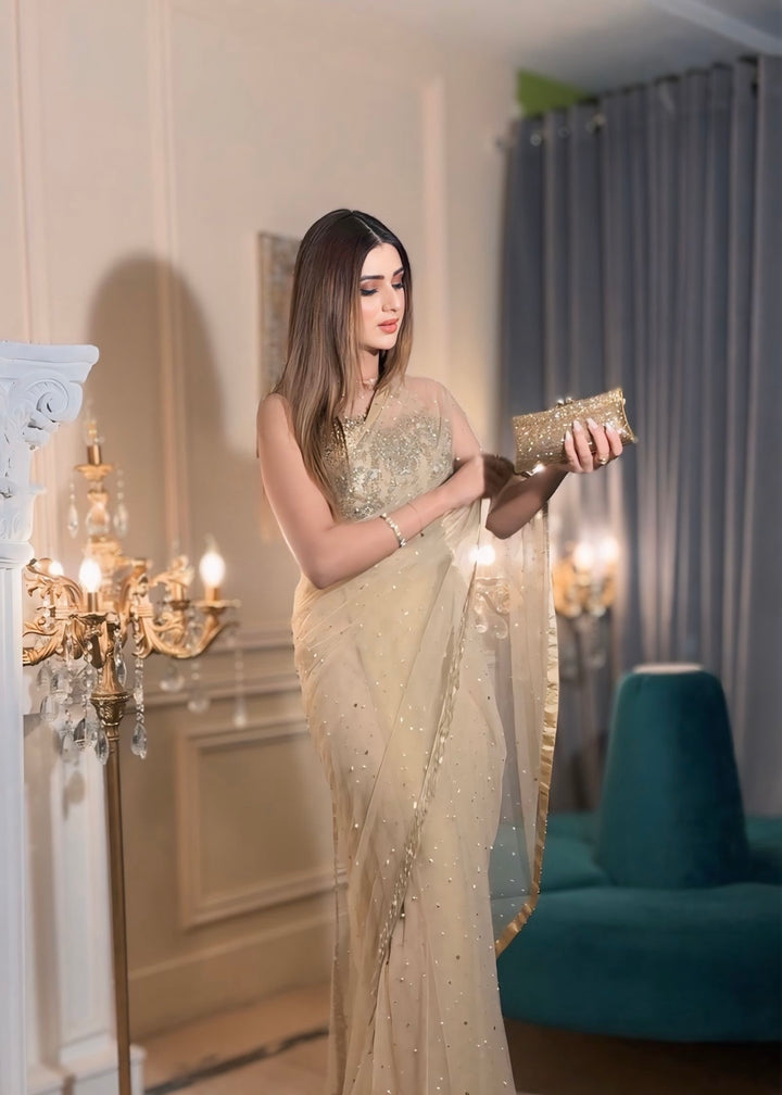 Drape yourself in elegance with this stunning gold saree, a true embodiment of luxury. Adorned with intricate nakshi, dabka, mukesh, and delicate pearls, each detail is meticulously crafted to create a mesmerizing look. The soft fabric falls gracefully, creating a beautiful silhouette that flatters your figure, allowing for effortless movement. The heavily embellished blouse features a gorgeous neckline that adds an extra touch of sophistication. Perfect for this wedding season, this saree ensures you shine and make a lasting impression.