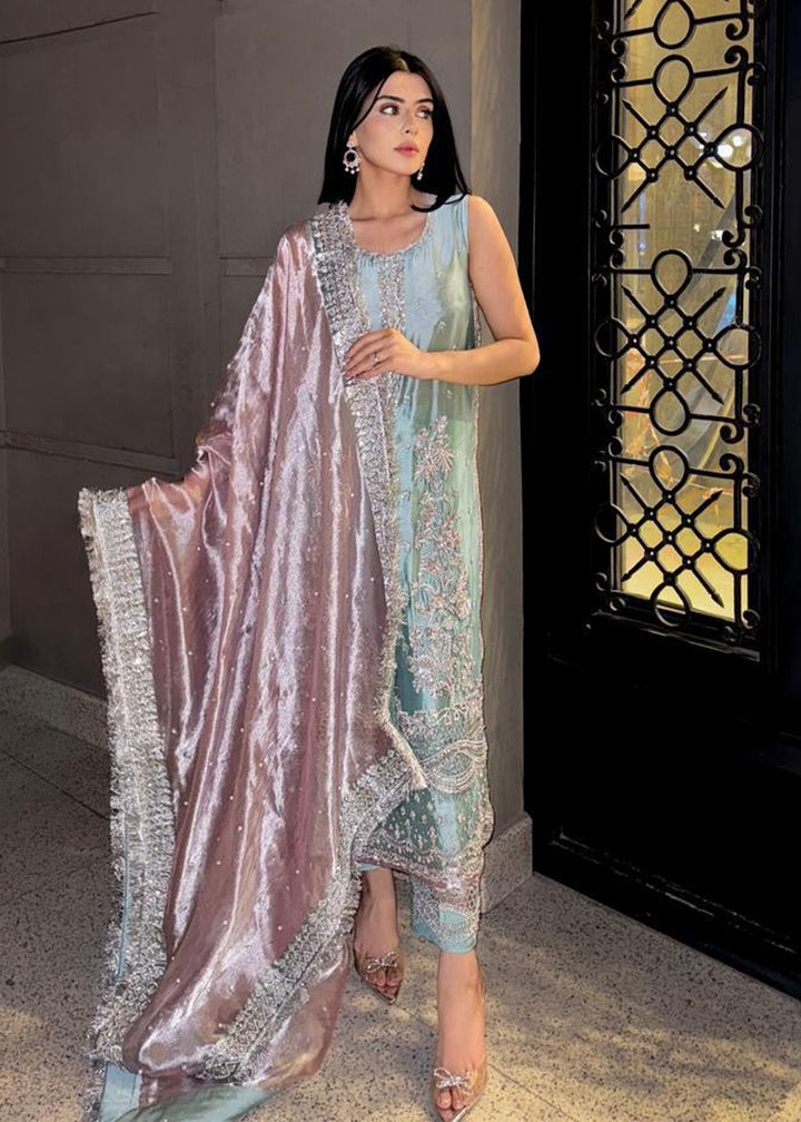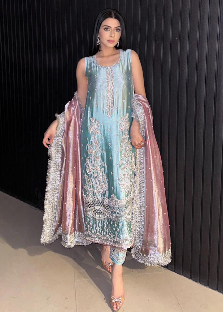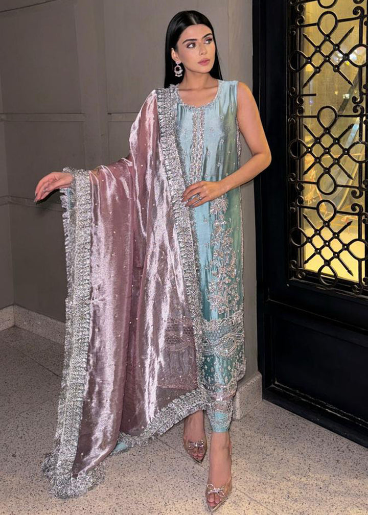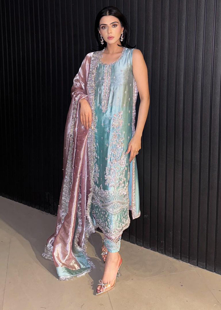 A pure tissue silk shirt with raw silk trousers and a tissue dupatta. Embellished with cutdana, Swarovski, dabka, and cutwork. Pink patti accents highlight the shirt sides with fine detailing. The trousers are embellished, and the dupatta features a four-sided border with scattered spray.