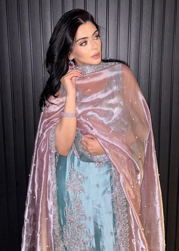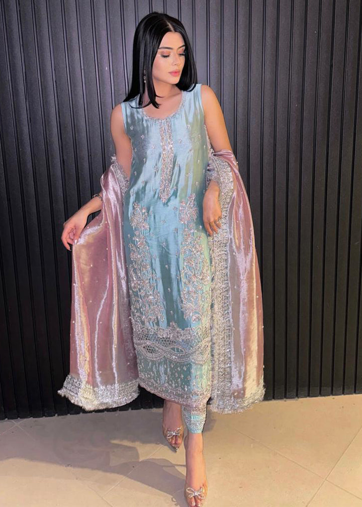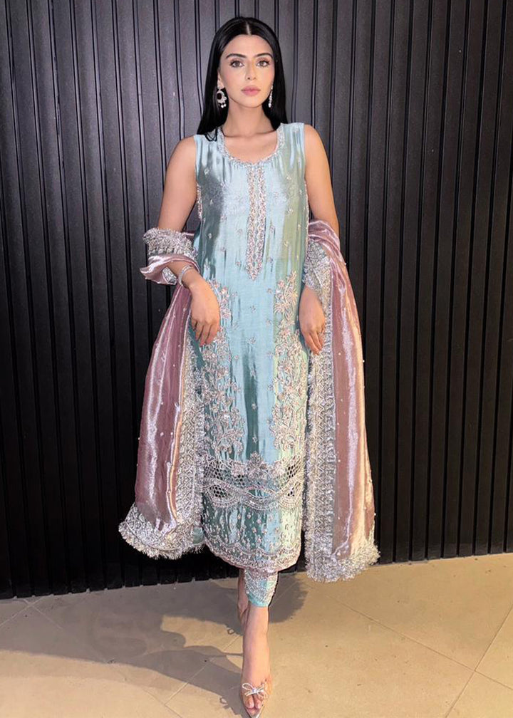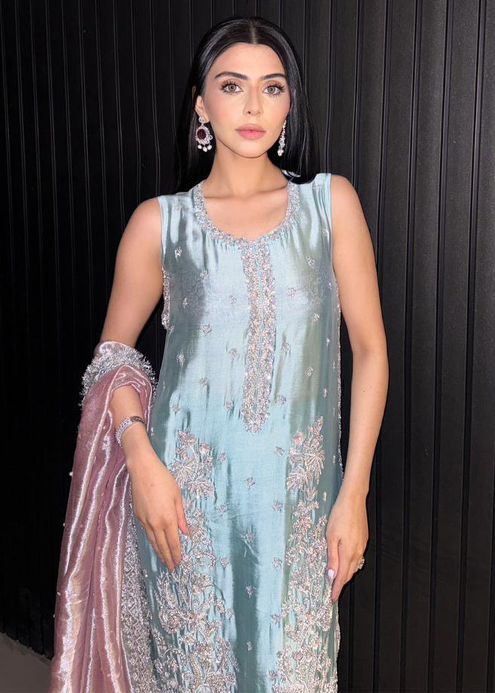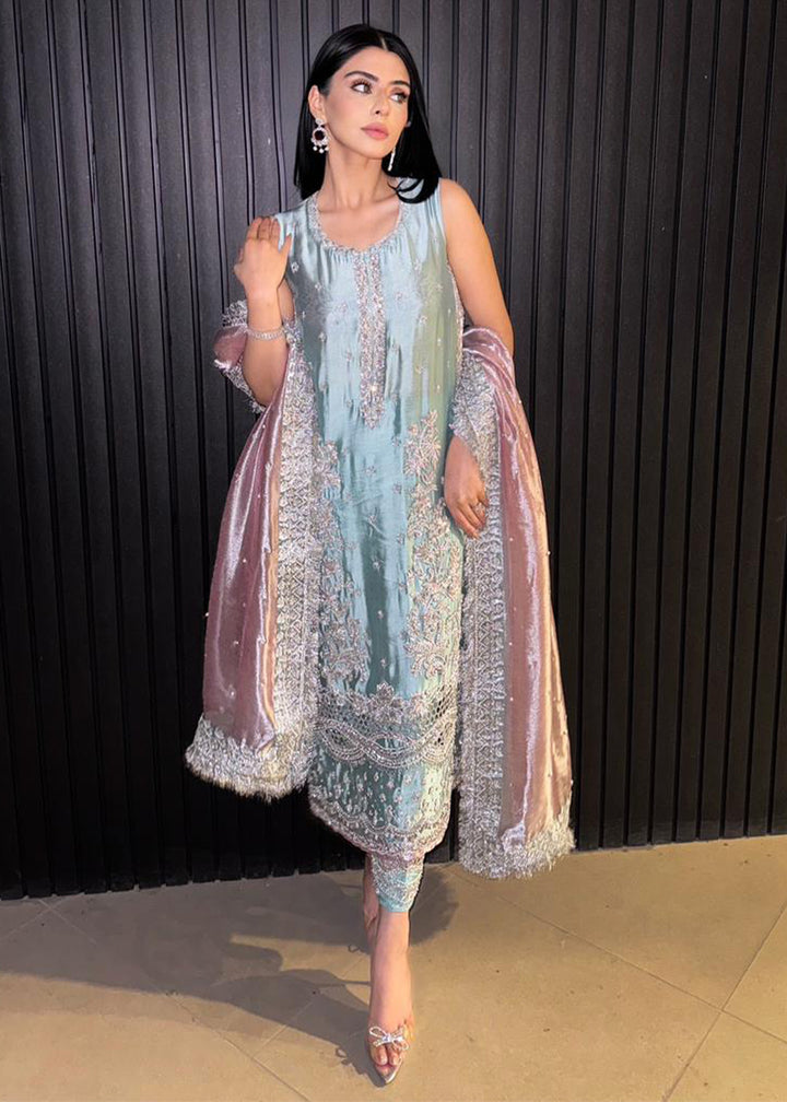 A pure tissue silk shirt with raw silk trousers and a tissue dupatta. Embellished with cutdana, Swarovski, dabka, and cutwork. Pink patti accents highlight the shirt sides with fine detailing. The trousers are embellished, and the dupatta features a four-sided border with scattered spray.